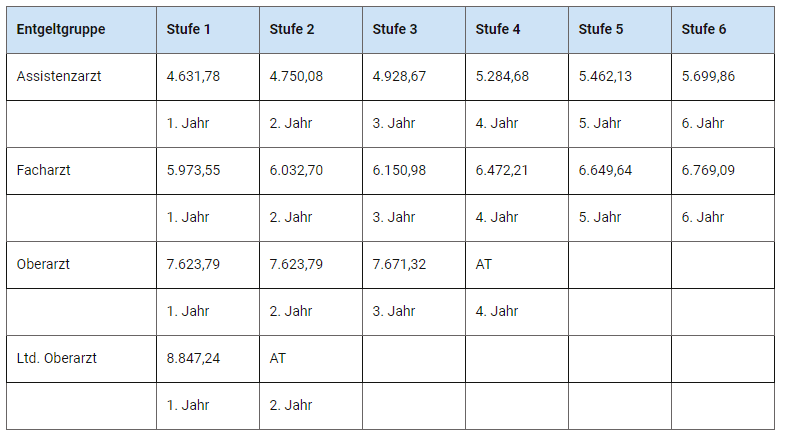 Grupa wynagrodzeń Ä1 prezentuje zarobki lekarza rezydenta w Niemczech w zależności od roku, w którym rozpoczął pracę jako asystent. Wynagrodzenie lekarza rezydenta znajduje się w wierszu Ä1 w kolumnie 1 (Stufe 1). Dalsze poziomy są osiągane w zależności od odpowiedniego czasu, w którym objęto stanowisko lekarza asystenta (na przykład od drugiego roku, od trzeciego roku itp.) :